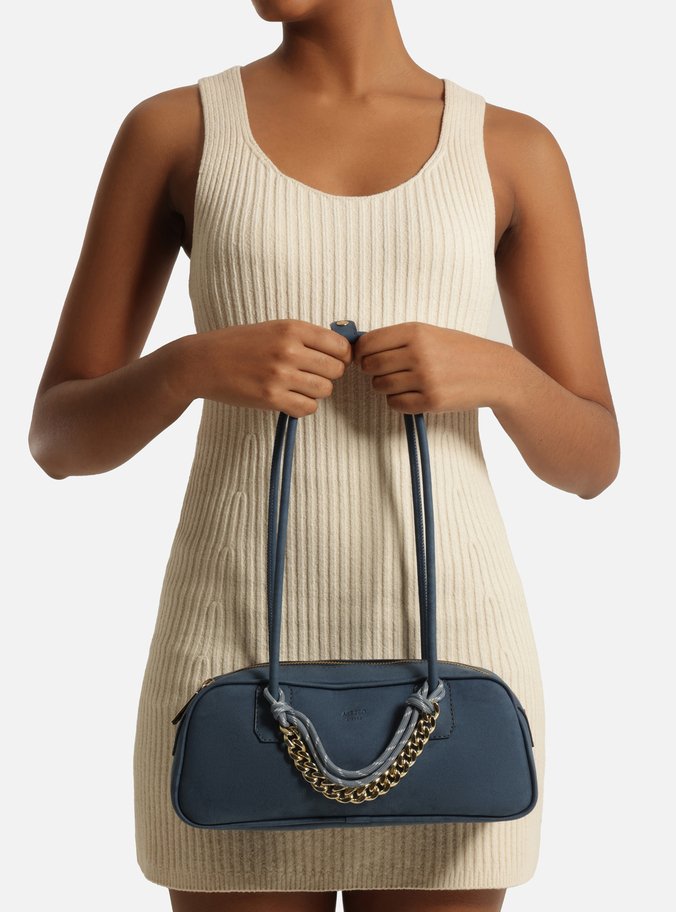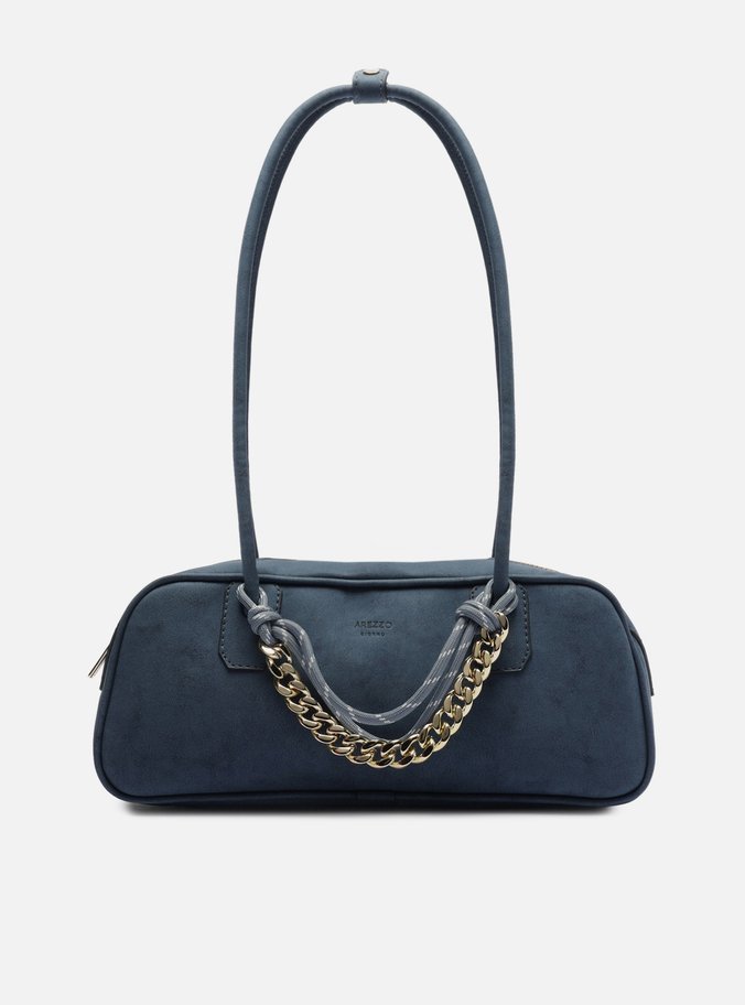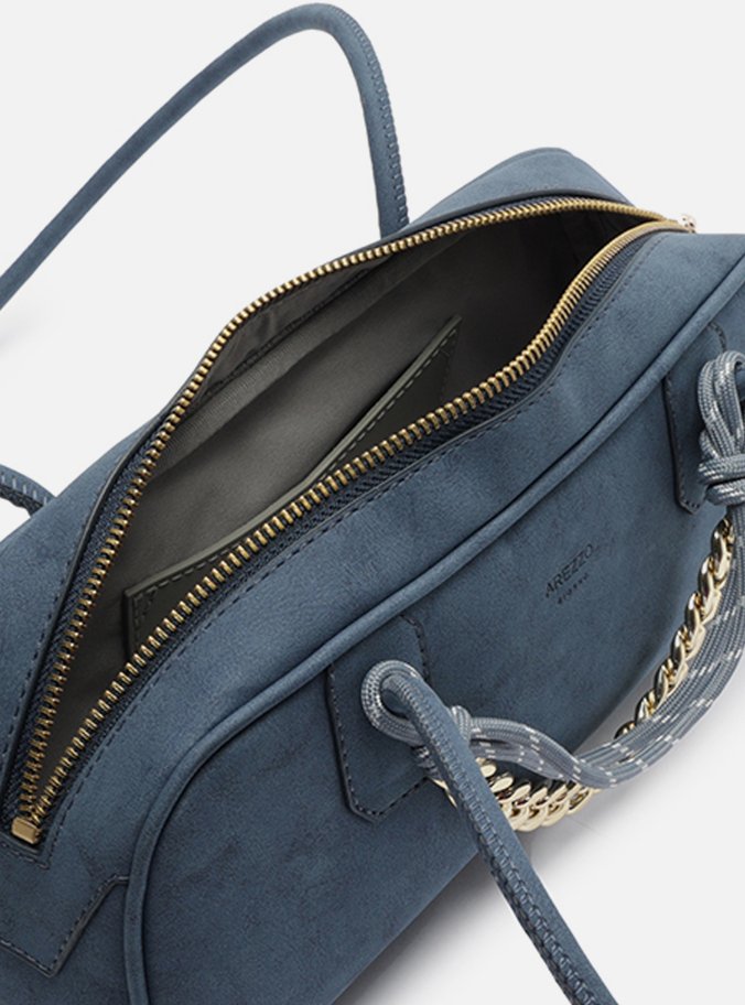 Descrição: Bolsa feminina bowling grande azul em nobuck com acabamento emborrachado. O acessório tem formato retangular e estruturado, laterais arredondadas e fecho em zíper com puxador. Possui duas alças de ombro. Detalhe frontal em corrente metálica dourada e cordão da cor da bolsa, presos a uma das alças por nós