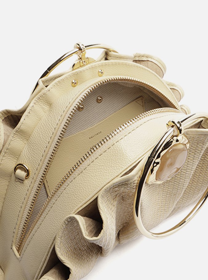 Descrição: Bolsa tiracolo pequena em couro e palha natural. O acessório tem formato estruturado e meia-esfera com franzidos nas capas. Traz alças em argolas douradas, presas por pedra e metal orgânico, além de alça tiracolo regulável e removível. Com fecho superior em zíper.