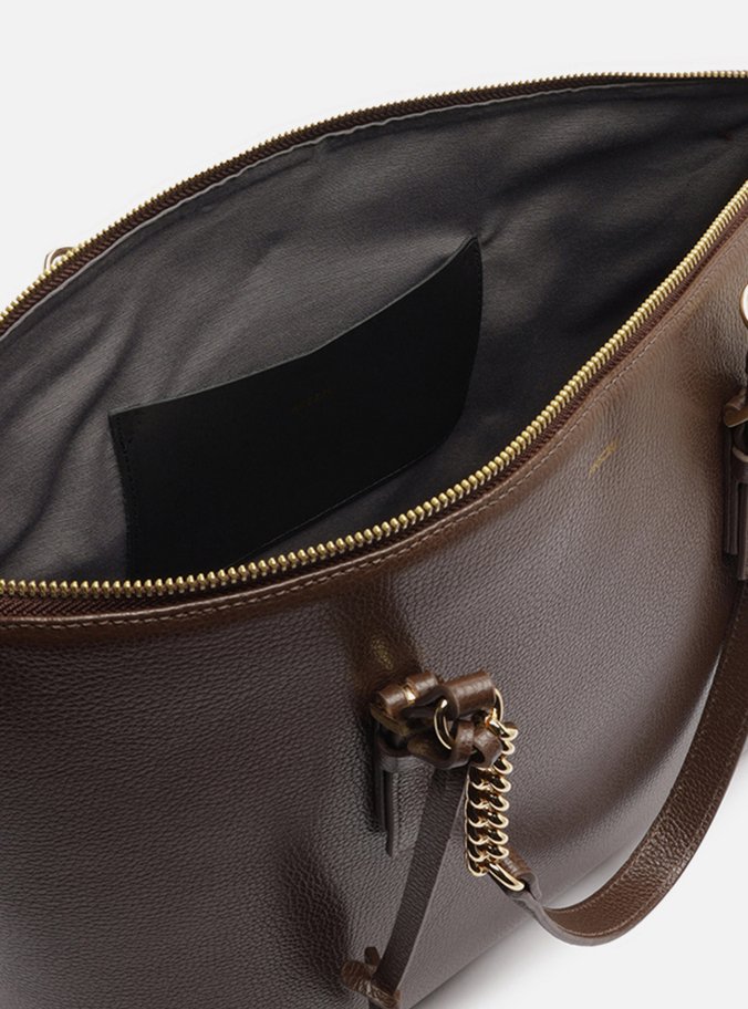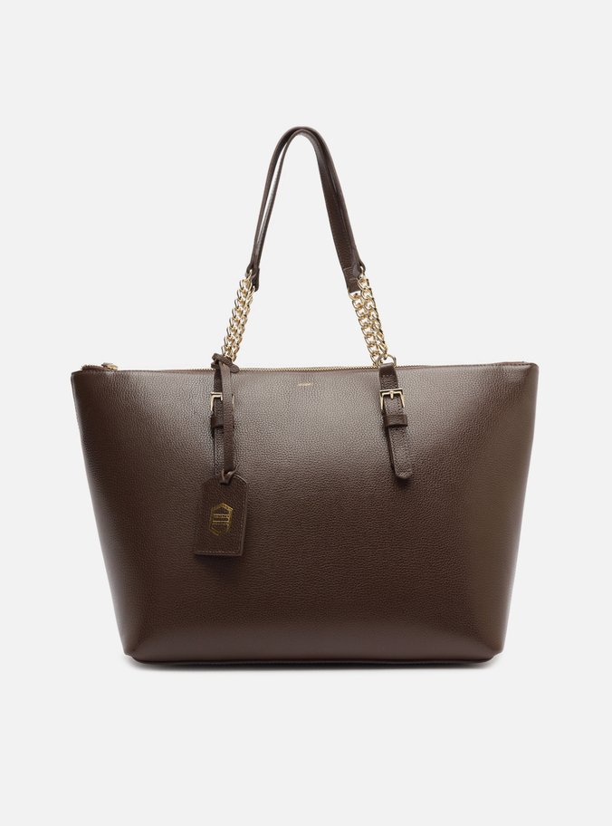 Descrição: Bolsa shopping grande de couro marrom. O acessório tem formato estruturado e laterais retas. Traz alças de ombro em tiras de couro reguláveis por fivela e corrente metálica. Com fecho em zíper e puxador. Acompanha bag charm em couro com gravação dourada de forma geométrica.