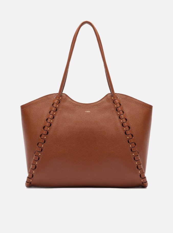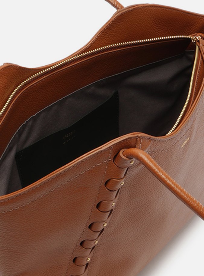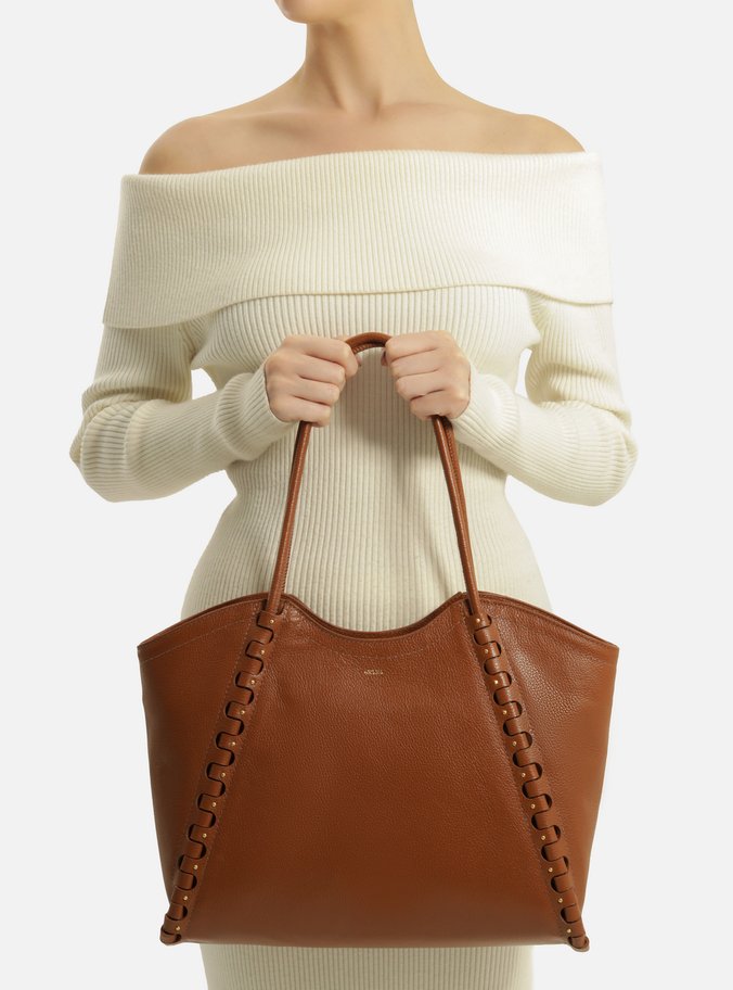 Descrição: Bolsa shopping grande de couro marrom. O acessório tem formato estruturado e laterais amplas. Traz duas alças de ombro em rolotê, que passam pelas capas e seguem até as laterais, presas por detalhe recortado e tramado com rebites metálicos aplicados. Possui fecho superior em zíper com puxador. Com inscrição discreta do nome da marca na capa.