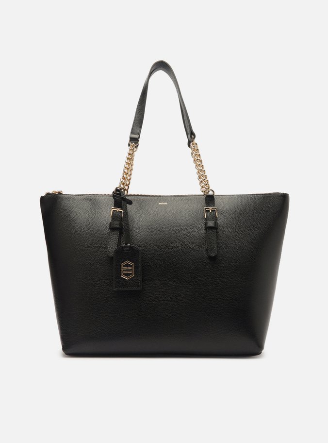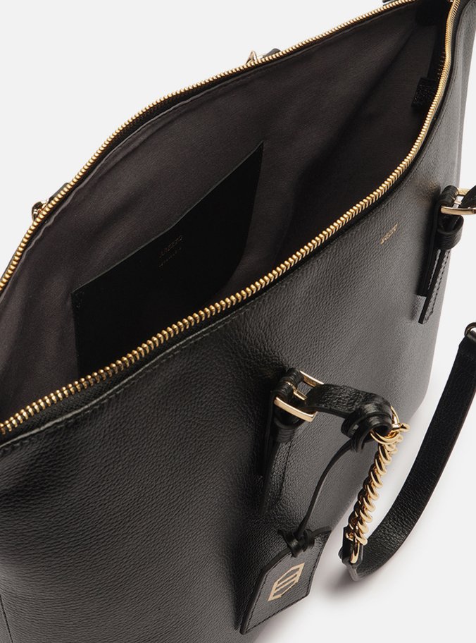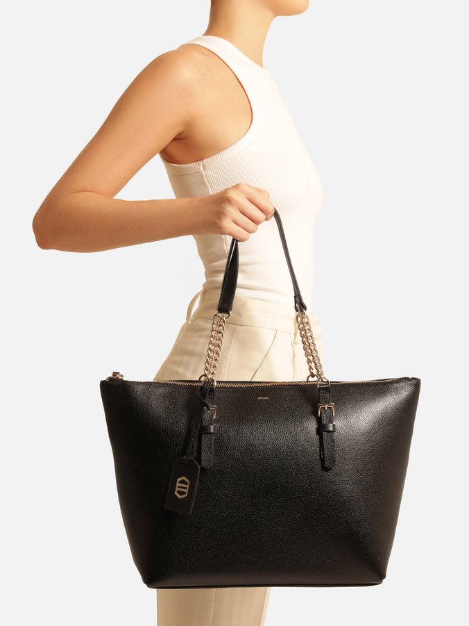 Descrição: Bolsa shopping grande de couro preta. O acessório tem formato estruturado e laterais retas. Traz alças de ombro em tiras de couro reguláveis por fivela e corrente metálica. Com fecho em zíper e puxador. Acompanha bag charm em couro com gravação dourada de forma geométrica.