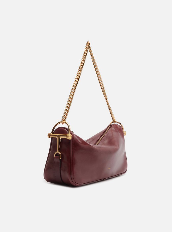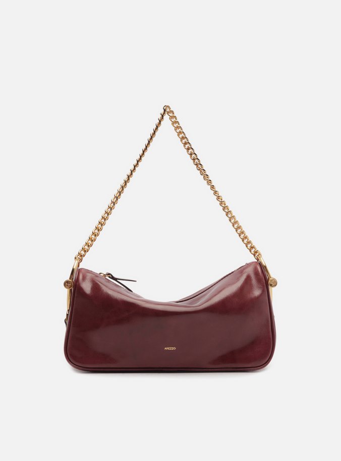 Descrição: Bolsa shoulder média de couro bordô. O acessório tem formato estruturado e alongado. Traz alça de ombro em corrente metálica dourada, presa por metais robustos nas laterais. Possui fecho superior em zíper com puxador.