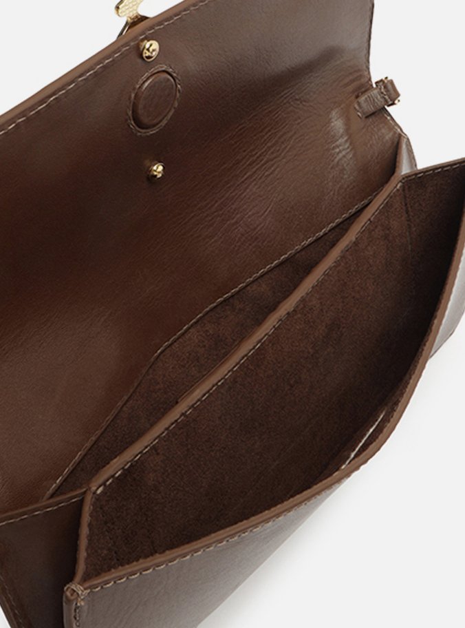 Descrição: Bolsa shoulder pequena em couro marrom. O acessório tem formato estruturado e acabamento macio. Traz detalhe frontal em metais dourados com inspiração marítima. Possui fecho em tampo com imã e alça removível em corrente metálica.