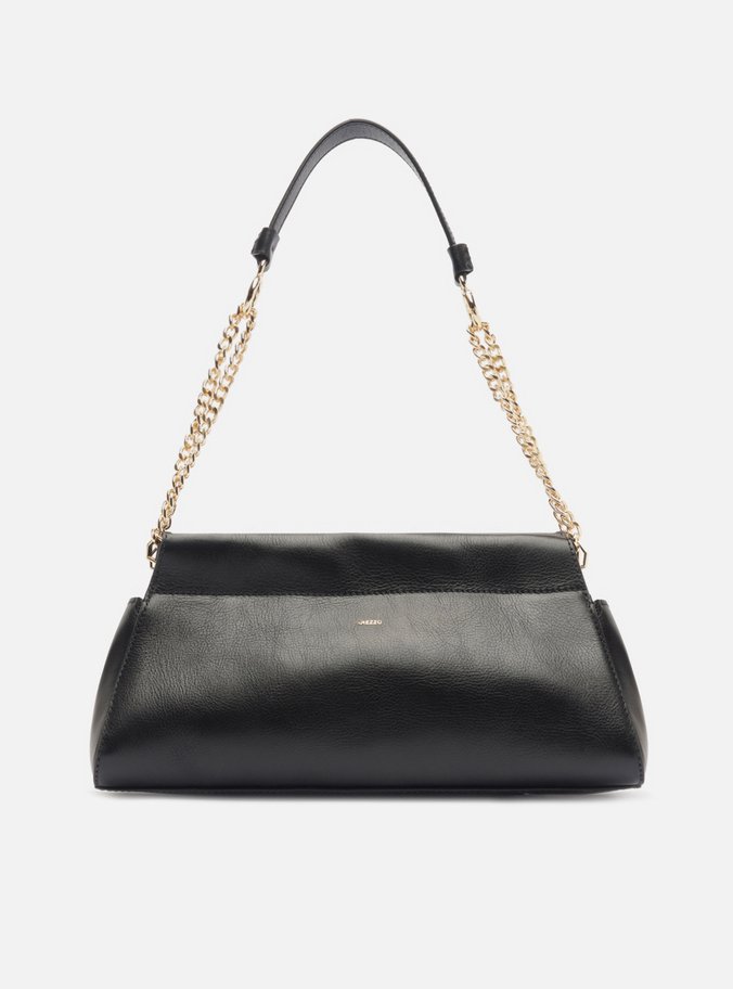 Descrição: Bolsa shoulder grande de couro preta. O acessório tem formato estruturado e alongado, com base mais larga. Traz alça lateral composta por correntes metálicas douradas e tira de couro, presas por argolas metálicas. Possui fecho superior em ímã.
