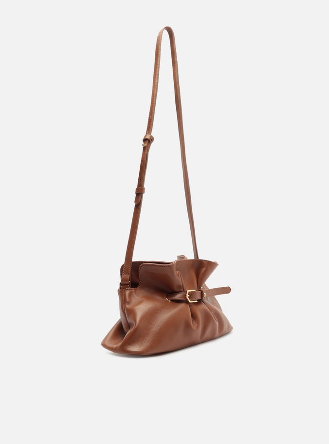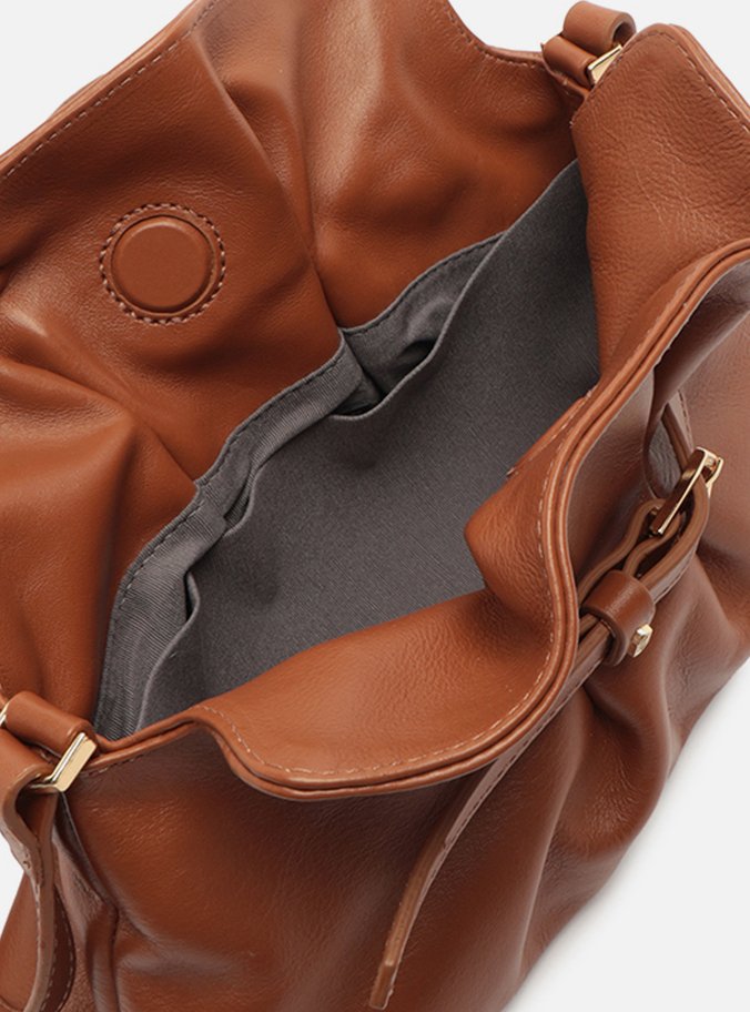 Descrição: Bolsa tiracolo feminina média de couro marrom. O acessório tem formato macio com efeito amassado e drapeados. Traz alça tiracolo fina regulável e fecho superior em ímã interno. Possui divisória interna e detalhe frontal em tira fina transpassada, com fivela metálica e passador com aplicação geométrica de metal.