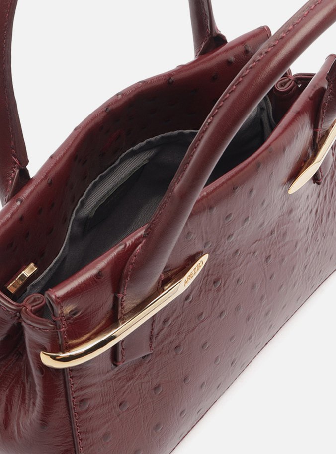 Descrição: Bolsa tote média de couro bordô com textura e relevo em bolinhas. O acessório tem formato estruturado, com base maior e laterais arredondadas. Traz duas alças de mão estruturadas e alça lateral longa regulável e removível, presa por ganchos metálicos. Possui fecho superior em ímã interno. Apresenta detalhe na capa frontal em metais dourados, com nome da marca, que funcionam como porta-alça.