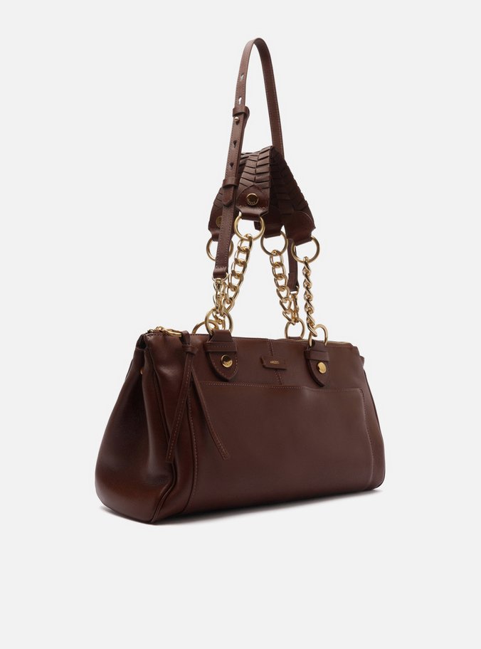 Descrição: Bolsa tote grande de couro marrom. O acessório tem formato estruturado e laterais arredondadas com redutores em ímã. Traz alça lateral fina, regulável e removível, além de alças de mão em tiras largas com efeito relevo e correntes metálicas douradas aplicadas na base, presas por argolas metálicas. Possui fecho superior em zíper, bolso externo frontal aberto e tag com inscrição do nome da marca.