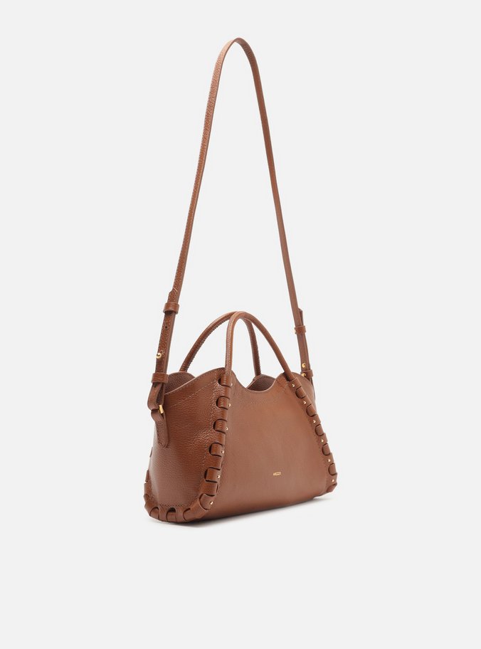 Descrição: Bolsa tote média de couro marrom. O acessório tem formato estruturado e acabamento texturizado. Traz duas alças de mão em rolotê, que atravessam as capas e seguem até as laterais, fixadas por detalhe recortado e tramado com rebites metálicos aplicados. Conta ainda com alça lateral longa, ajustável e removível, proporcionando diferentes formas de uso. Possui fecho superior em zíper com puxador. Com inscrição discreta do nome da marca na capa.