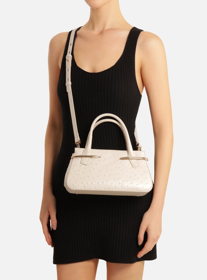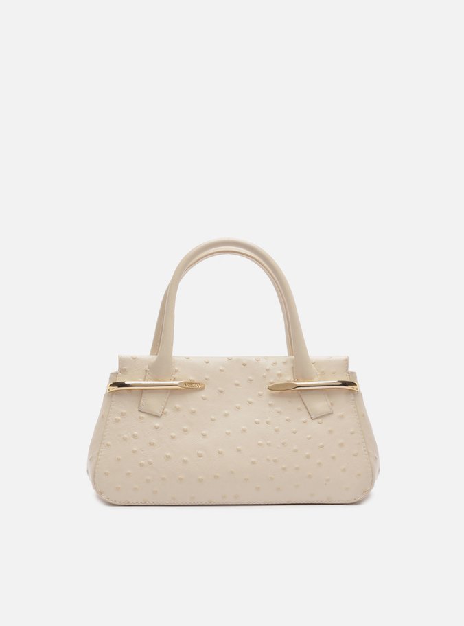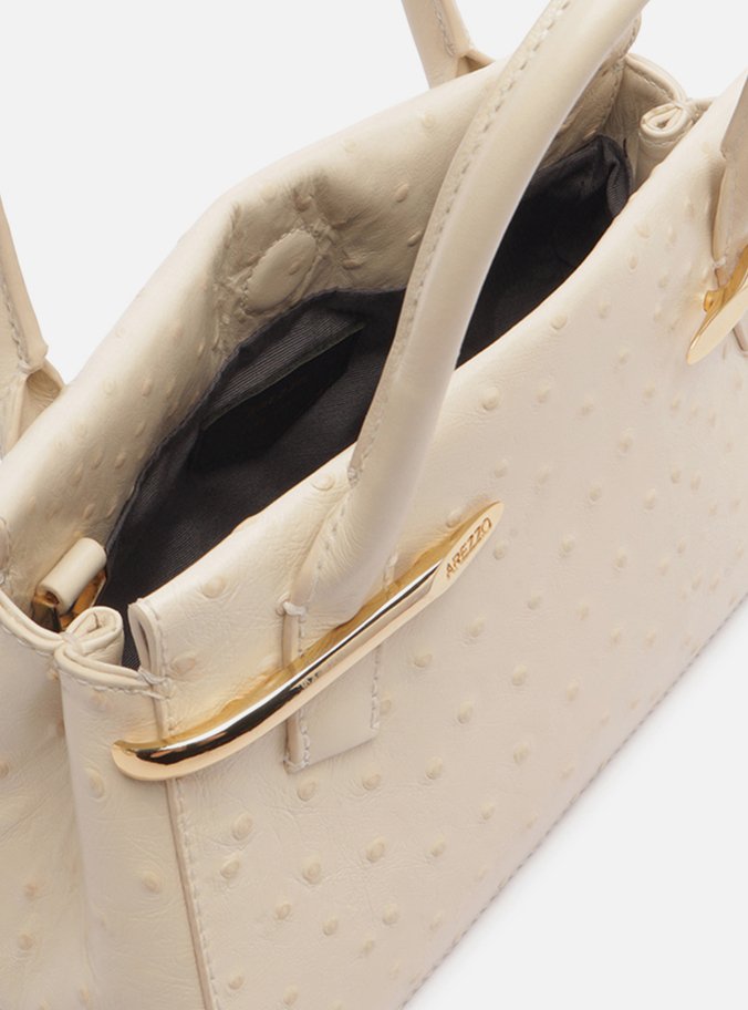 Descrição: Bolsa tote média de couro off-white com textura e relevo em bolinhas. O acessório tem formato estruturado, com base maior e laterais arredondadas. Traz duas alças de mão estruturadas e alça lateral longa regulável e removível, presa por ganchos metálicos. Possui fecho superior em ímã interno. Apresenta detalhe na capa frontal em metais dourados, com nome da marca, que funcionam como porta-alça.