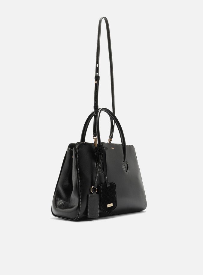 Descrição: Bolsa feminina tote média de couro preta. O acessório tem formato estruturado, acabamento liso, recortes na parte superior para saída das alças e laterais com redutores em botões. Traz alça tiracolo fina com regulagem e alças de mão estruturadas. Com fecho superior em zíper, puxador em tira e bolso interno. Acompanha dois bag charm, um liso em couro e outro acamurçado com matelassê e detalhe em metal, presos à bolsa por tiras finas.