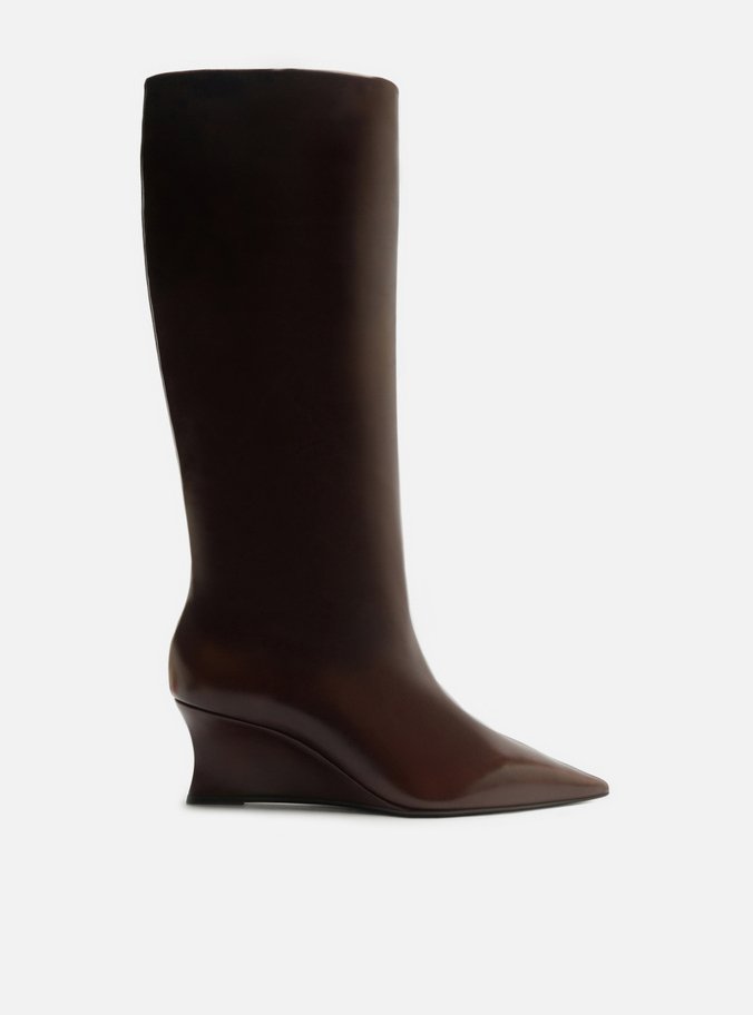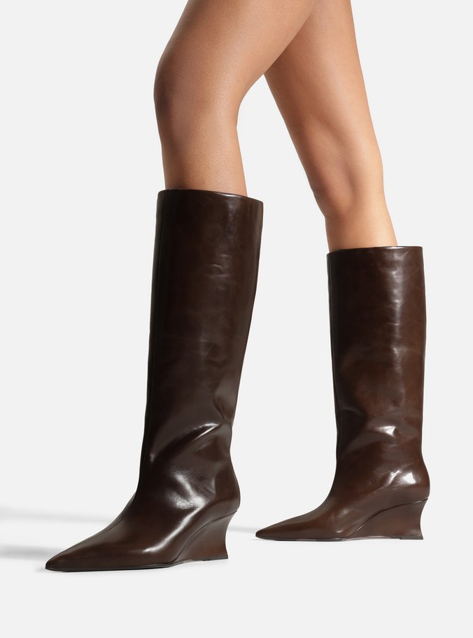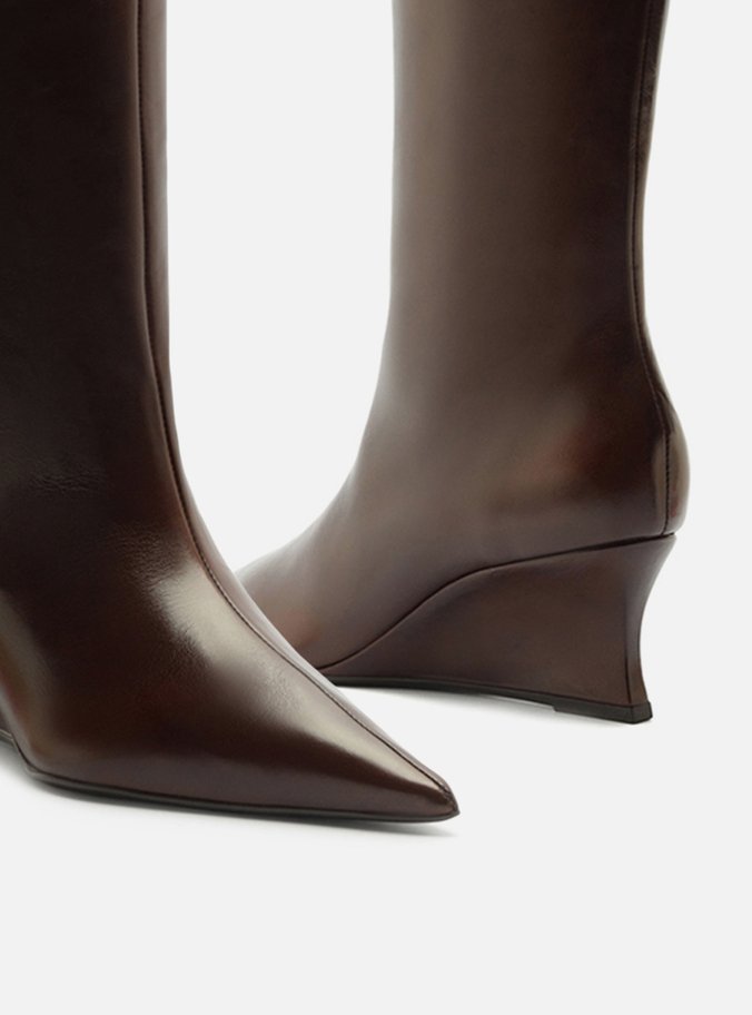 Descrição: Bota feminina marrom de couro. O sapato tem cano alto, salto baixo anabela e formato fino na ponta. Possui cabedal ajustado à perna.