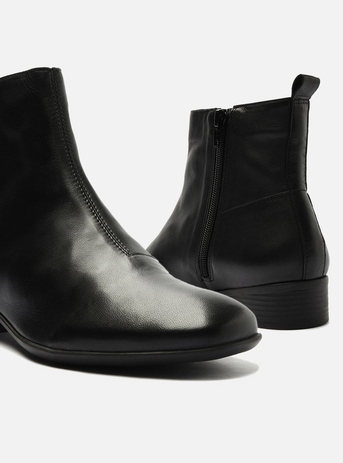 Descrição: Bota preta. O modelo tem cano curto, salto baixo bloco e bico redondo. Traz cabedal liso com costuras discretas na parte frontal e traseira. Possui fecho em zíper na lateral interna do cano. Com tira vertical sobre o calcanhar e parte traseira do cano, que funciona como puxador e facilita o calce