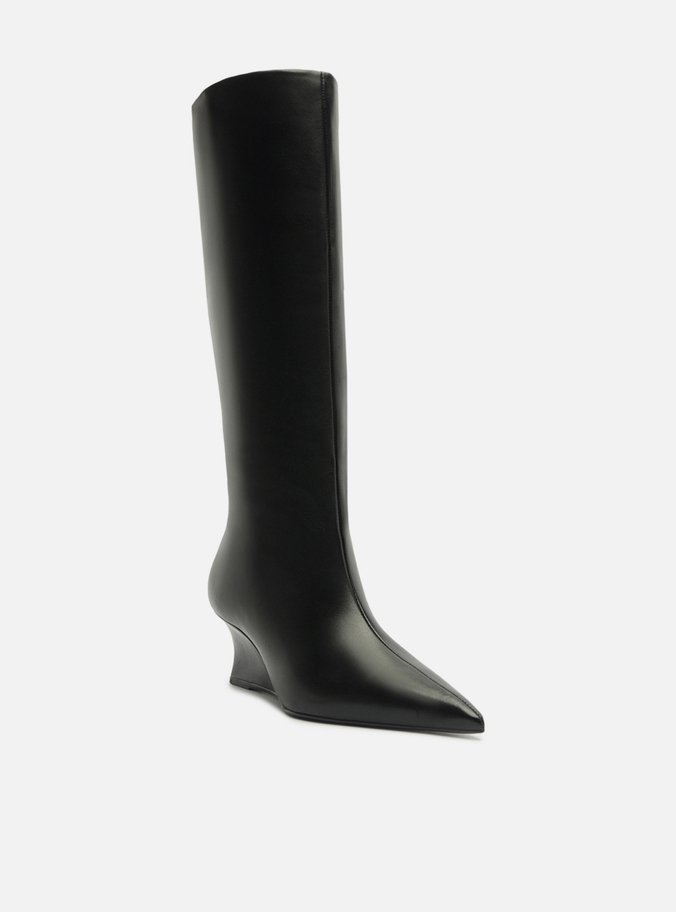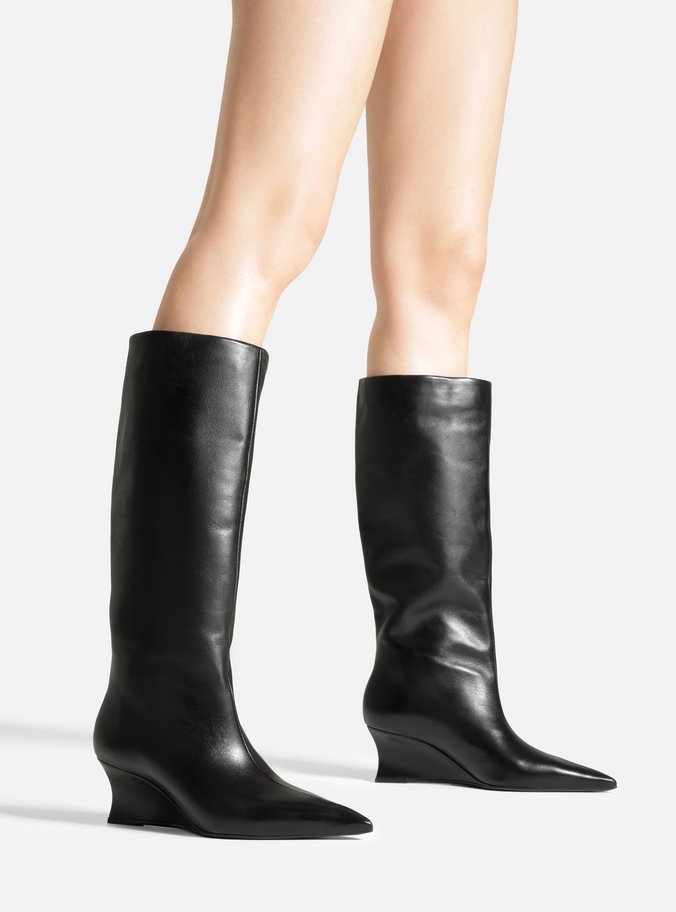 Descrição: Bota feminina preta de couro. O sapato tem cano alto, salto baixo anabela e formato fino na ponta. Possui cabedal ajustado à perna.