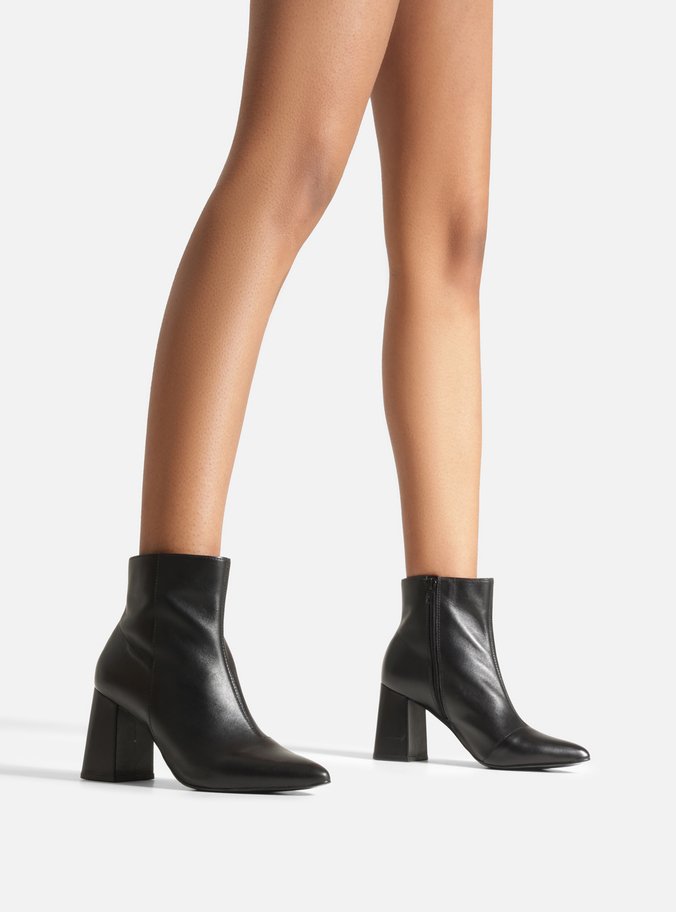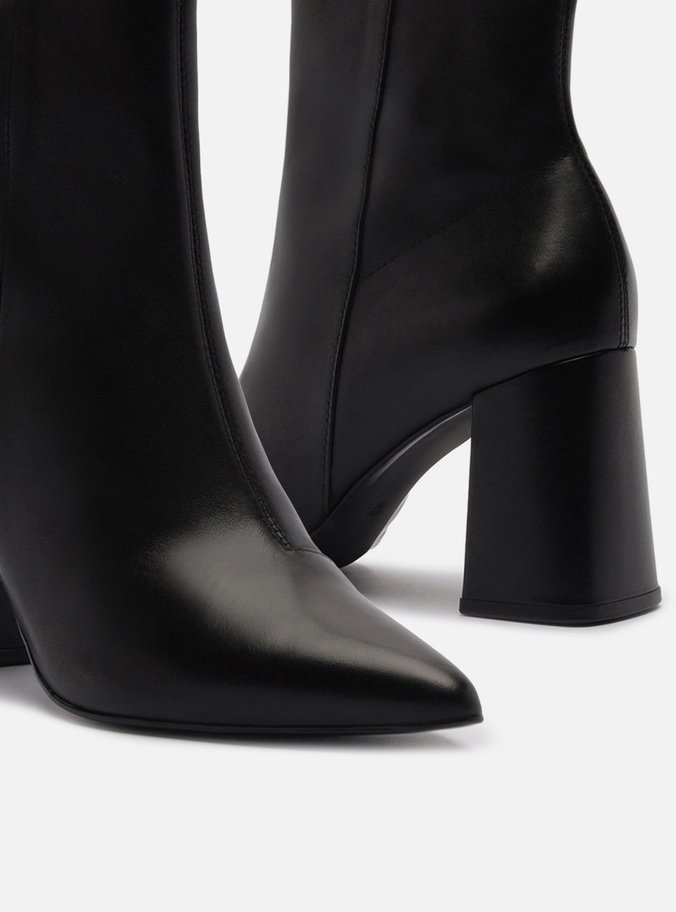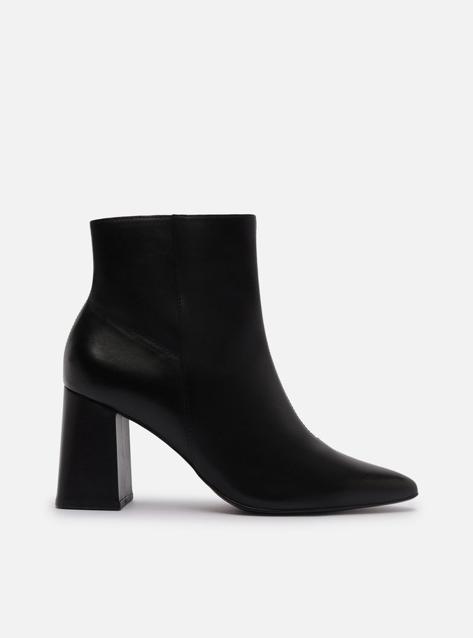Descrição: Bota feminina preta de couro. O sapato tem cano curto, salto médio bloco e ponta fina. Traz cabedal ajustado ao pé e fecho em zíper na lateral interna do cano, além de costura central.