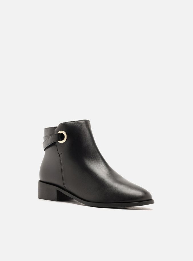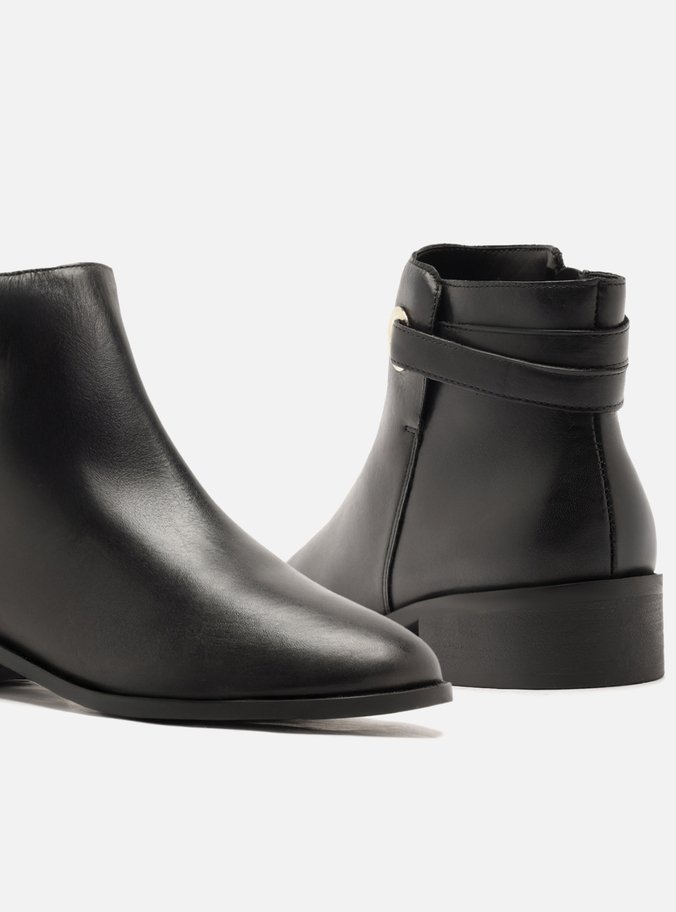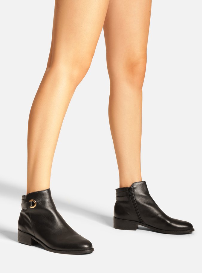 Descrição: Bota preta de couro. O sapato tem cano curto, salto baixo bloco e formato arredondado na ponta. Traz cabedal ajustado ao pé e fecho em zíper na lateral interna do cano. Com detalhe recortado na lateral externa, ilhós vazado e tiras que contornam a parte traseira do cano.