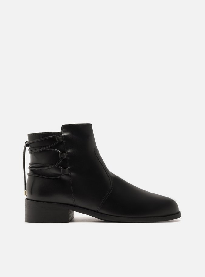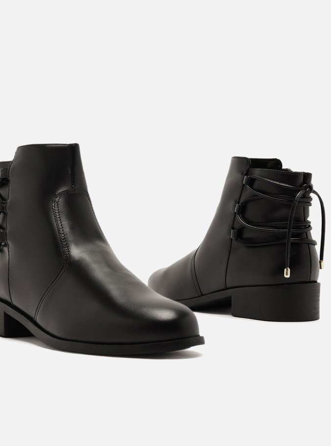 Descrição: Bota preta de couro. O sapato tem cano curto, salto baixo bloco e formato arredondado na ponta. Traz cabedal ajustado ao pé e fecho em zíper na lateral interna do cano. Com detalhe recortado na lateral externa e tiras cruzadas na parte traseira do cano, com ponteiras e que fecham em nó.