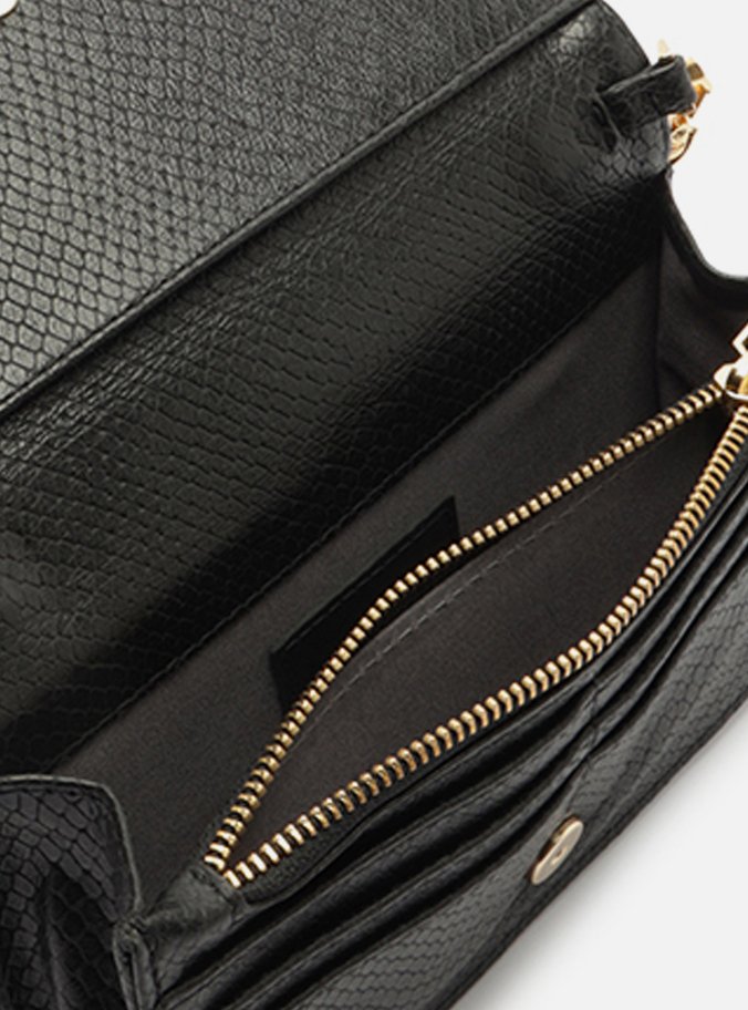 Descrição: Bolsa clutch preta em couro com textura snake. O acessório tem formato retangular. Possui alça tiracolo longa em corrente metálica e tira de couro transpassada, regulável e com pingente em esfera de metal. Possui fecho em tampo e imã interno. Com aplicação de metal geométrico e vazado na capa. Interno com bolso fechado por zíper e porta-cartões.