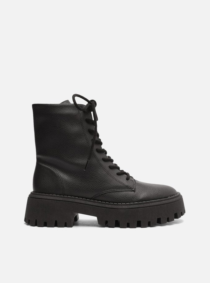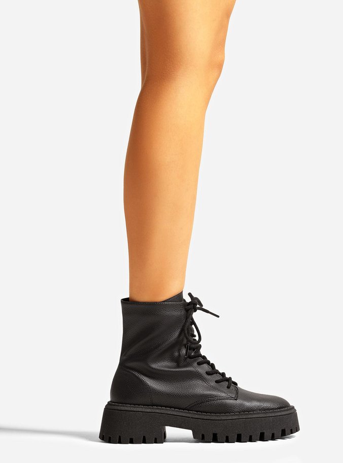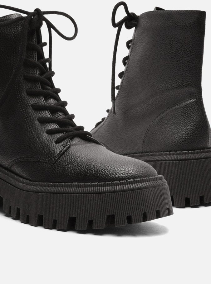 Descrição: Bota coturno preta. O modelo tem cano médio, salto baixo e bico redondo. Possui solado flatform e base emborrachada tratorada, bipartida e com ranhuras, além de contorno superior em costura pesponto. Traz fecho em amarração por cadarços pretos cobrindo todo o cano.