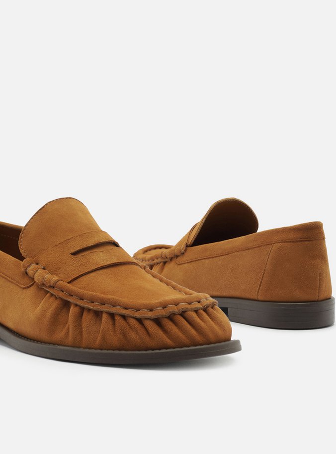 Descrição: Mocassim feminino marrom em camurça. O sapato tem salto rasteiro e formato arredondado na ponta. Fechado, traz recorte lateral na gáspea e aplicação de tira vazada sobre o cabedal. Possui costura marcada no contorno da biqueira e franzido na parte frontal. Exibe toda a parte superior do pé.