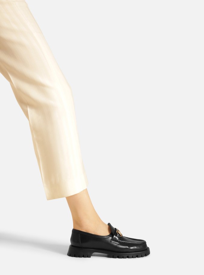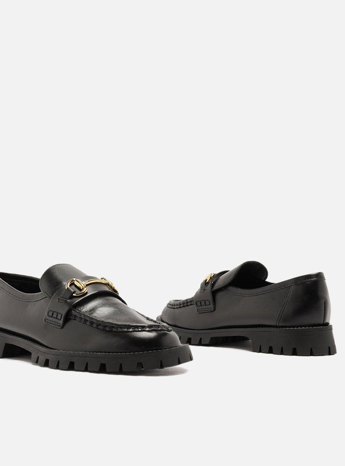 Descrição: Mocassim feminino preto de couro. O sapato tem salto baixo bloco e formato quadrado na ponta, além de sola emborrachada, tratorada e bipartida. Fechado, traz recorte lateral na gáspea e aplicação de tira e bridão metálico dourado sobre o cabedal. Possui costura marcada no contorno da biqueira. Exibe toda a parte superior do pé.
