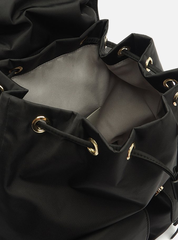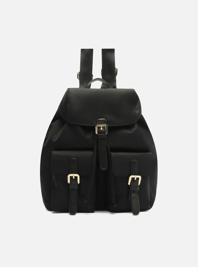 Descrição: Mochila média preta em nylon. O acessório tem formato maleável. Possui alças de ombro reguláveis e alça de mão superior. O fechamento é em enforcador sob tampo frontal, com fecho em tira e fivela. Traz bolsos externos frontais, também com fechamento em tiras e fivelas.