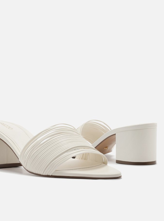 Descrição: Sandália feminina branca. O sapato tem salto médio bloco e formato arredondado na ponta. Traz diversas tiras finas na parte superior do pé e dedos. Com palmilha da cor da sandália e inscrição do nome da marca.