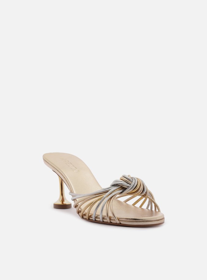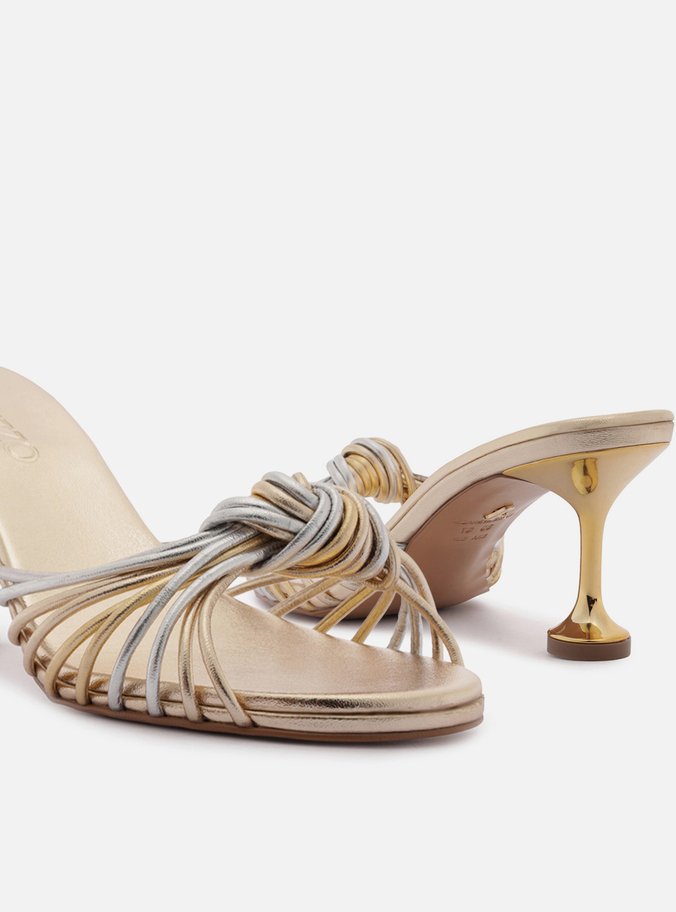 Descrição: Mule feminina dourada. O sapato tem salto médio taça metálico dourado e formato arredondado na ponta. Possui tiras finas sobre os dedos, unidas por nó central, em mix de dourado e prata. Com palmilha dourada e tag com o nome da marca.