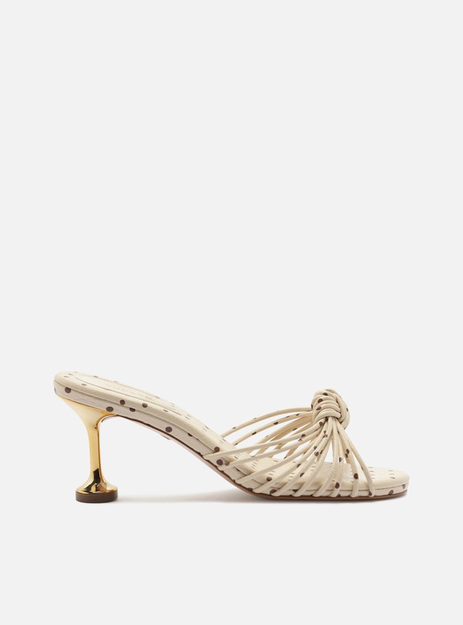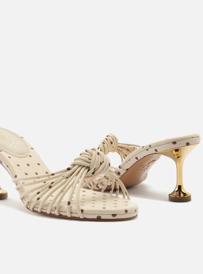 Descrição: Mule feminina off white com estampa poá marrom. O sapato tem salto médio taça metálico dourado e formato arredondado na ponta. Possui tiras finas sobre os dedos, unidas por nó central. Com palmilha na estampa do sapato e tag com o nome da marca.