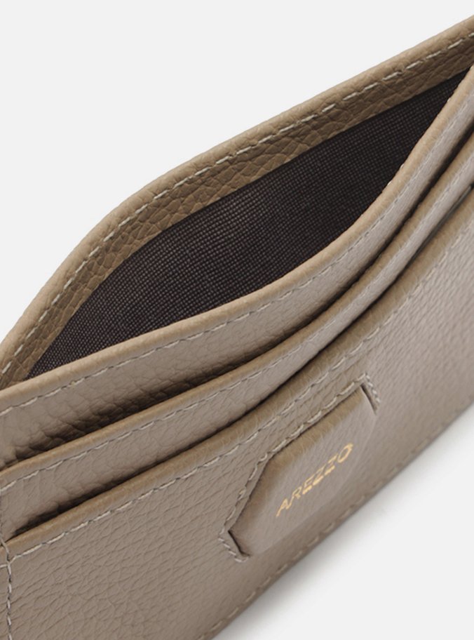 Descrição: Porta-cartões feminino pequeno de couro cinza. O acessório tem formato retangular e acabamento texturizado. Na capa frontal, traz aplicação de tag hexagonal com o nome da marca. Possui divisórias para cartões na parte frontal e interna.