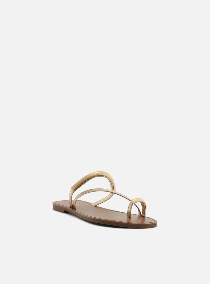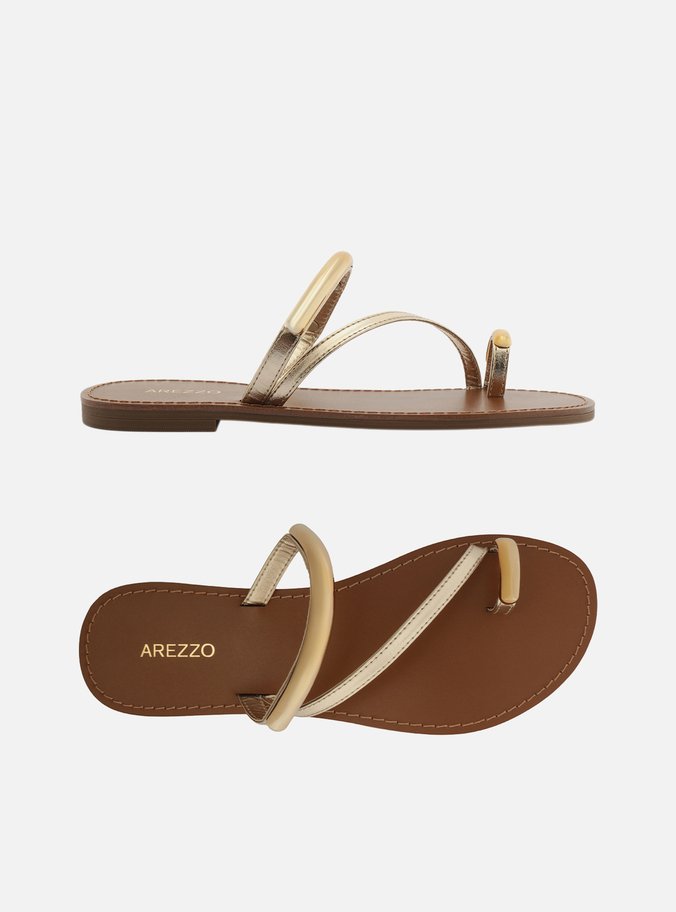 Descrição: Sandália rasteira dourada. O sapato tem sola flat e formato arredondado na ponta. Traz tira dedeira e tira na parte superior do pé, ambas com aplicação de metal dourado que acompanha a largura das tiras. Possui ainda tira diagonal no centro. Com palmilha marrom lisa, contorno em pesponto e inscrição do nome da marca.