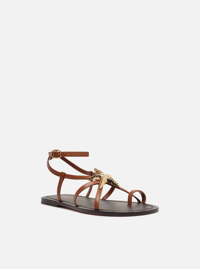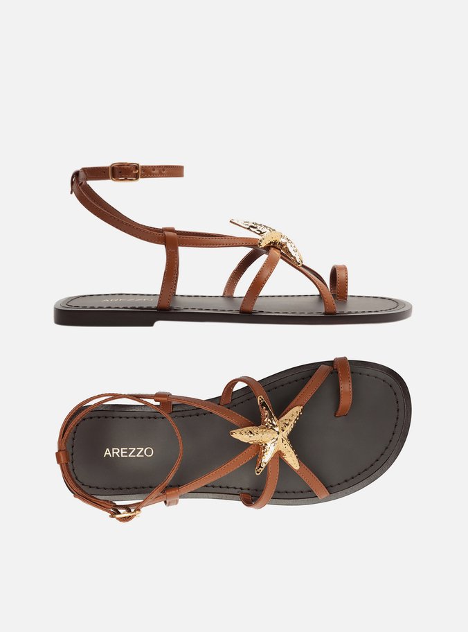 Descrição: Sandália rasteira feminina marrom de couro. O sapato tem salto rasteiro e formato arredondado na ponta. Traz tira fina na parte superior do pé, com aplicação de metal em forma de estrela-do-mar, e tira em torno do dedão. Possui mais duas tiras finas que saem das laterais frontais, cruzam na parte superior do pé, contornam o tornozelo e fecham em fivela lateral. Com palmilha lisa e nome da marca.