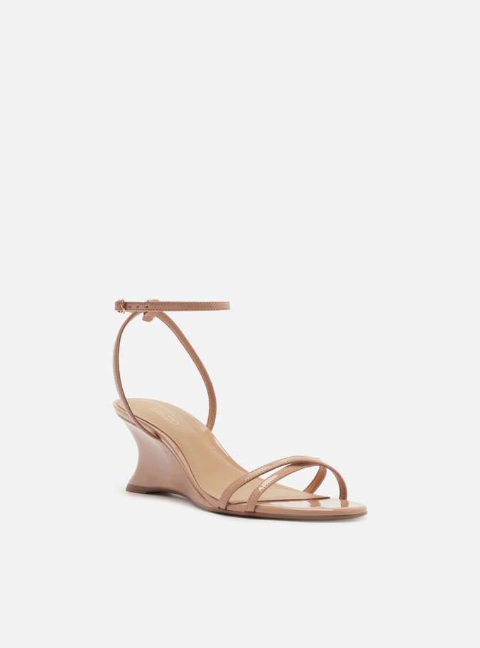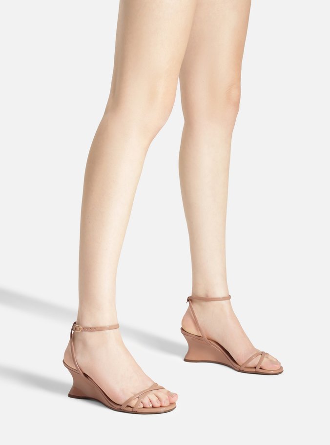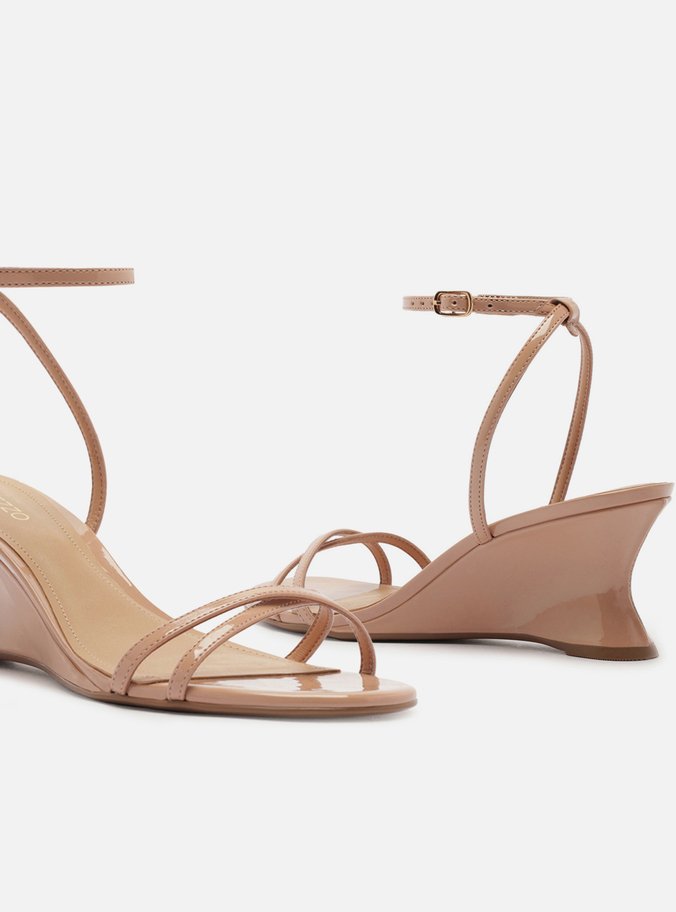 Descrição: Sandália feminina bege com acabamento envernizado. O sapato tem salto médio anabela curvo e formato arredondado na ponta. Traz tiras finas cruzadas sobre os dedos. Possui tira fina que sai das laterais, contorna o tornozelo e fecha em fivela lateral. Com palmilha bege e inscrição do nome da marca. A sandália exibe todo o pé.