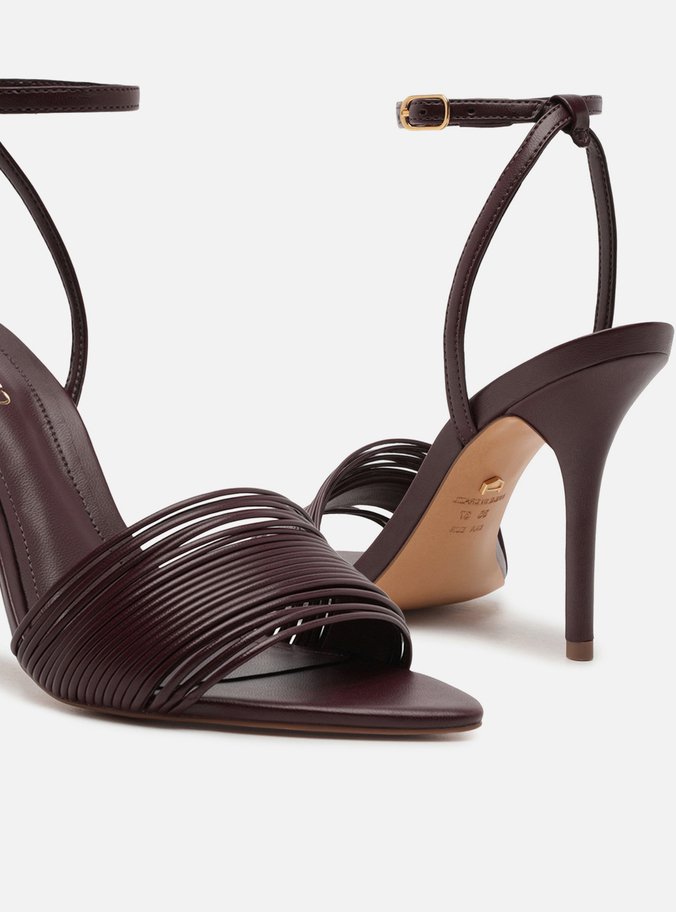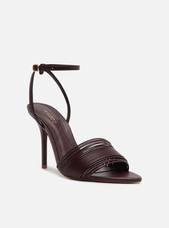 Descrição: Sandália feminina bordô. O sapato tem salto alto fino e ponta fina. Traz diversas tiras finas na parte superior do pé e dedos. Possui tira fina que sai das laterais, cruza no calcanhar, contorna o tornozelo e fecha em fivela lateral. Com palmilha da cor da sandália e inscrição do nome da marca. A sandália exibe todo o pé.