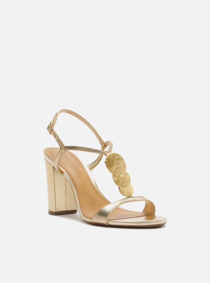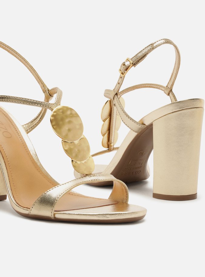 Sandália Dourada Couro Salto Alto Bloco Metais Textura