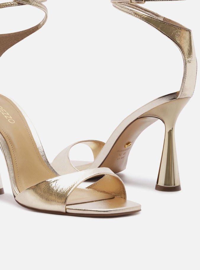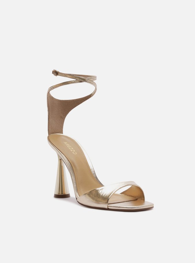Sandália Dourada Couro Salto Alto Taça Tiras