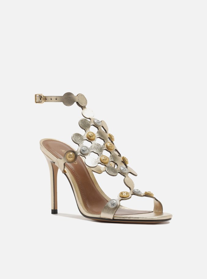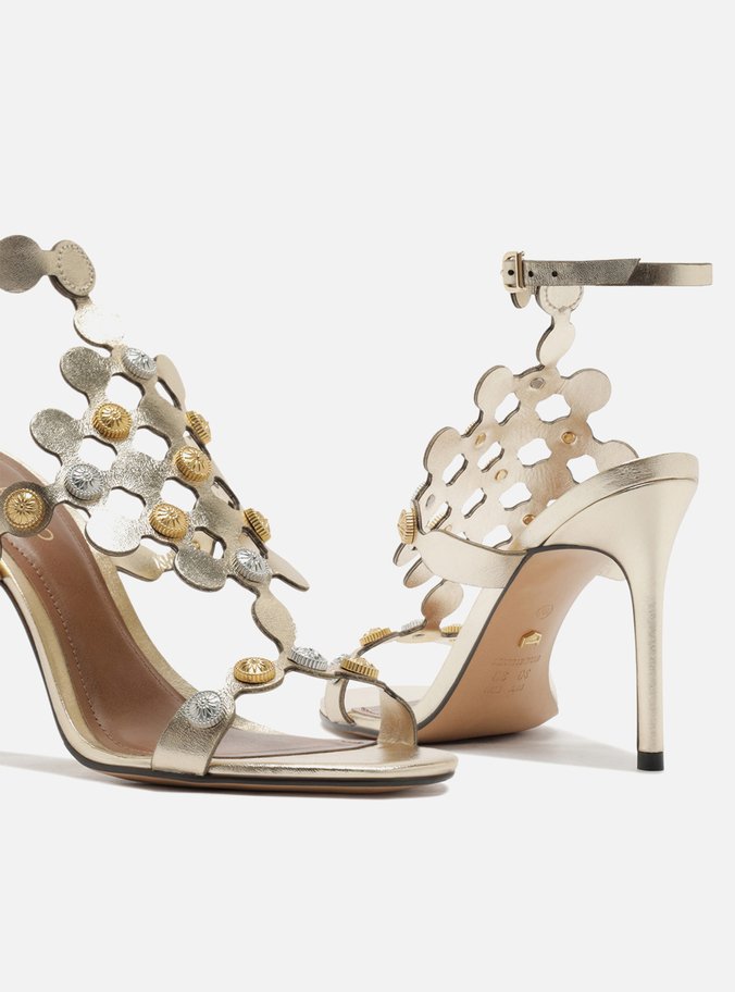 Sandália Dourada Couro Salto Fino Círculos Metais