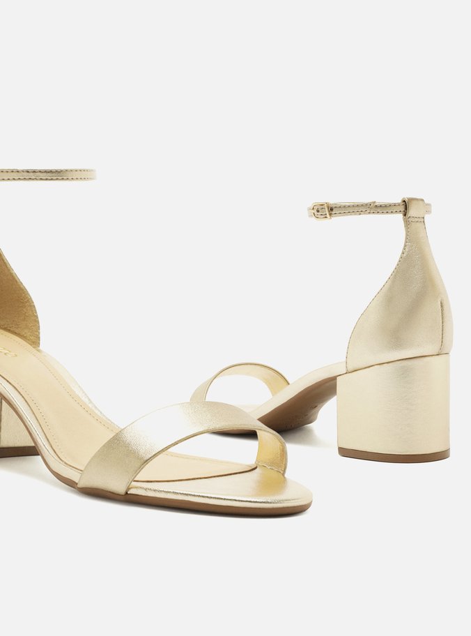 Descrição: Sandália dourada e de couro. O modelo tem salto médio bloco, revestido no mesmo material do calçado, e bico redondo. Traz tira média e lisa sobre os dedos. Fechada no calcanhar, possui tira fina em torno do tornozelo com fivela metálica lateral. Com palmilha bege e inscrição do nome da marca. A sandália exibe todo o peito do pé e os dedos.