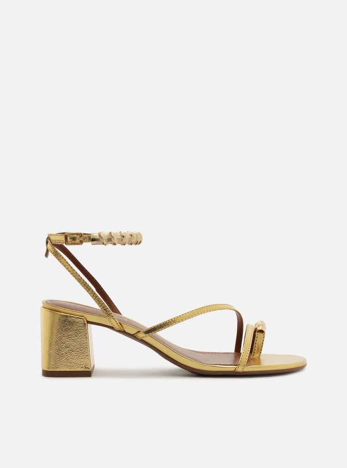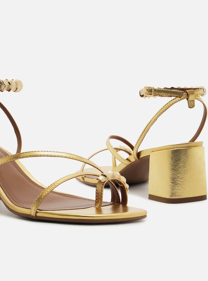 Sandália Dourada Couro Salto Médio Bloco Metais Dedeira