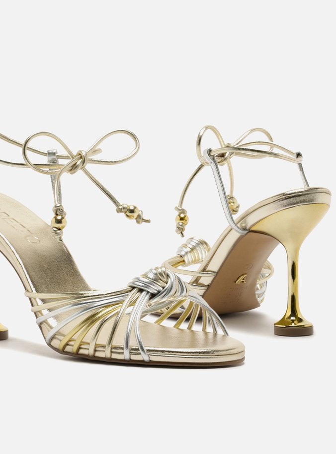 Descrição: Sandália feminina dourada. O sapato tem salto alto taça metálico dourado e formato arredondado na ponta. Possui tiras finas sobre os dedos, unidas por nó central, em mix de dourado e prata. Traz tira fina que contorna o tornozelo e fecha em amarração frontal, com ponteiras metálicas, além de tiras de suporte laterais. Com palmilha dourada e tag com o nome da marca.