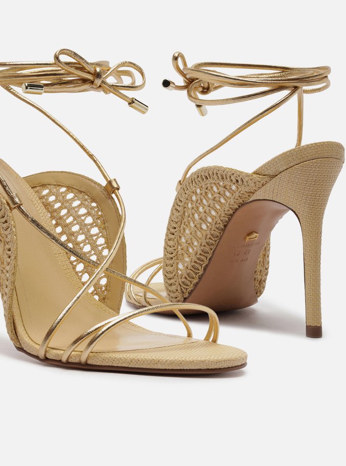 Descrição: Sandália feminina dourada e bege. O sapato tem salto alto fino e formato arredondado na ponta. Traz duas tiras finas sobre os dedos e tiras finas que cruzam na parte superior do pé, contornam o tornozelo e fecham em amarração superior. Possui laterais levemente cobertas com detalhe bordado e palmilha na mesma cor, com inscrição do nome da marca.
