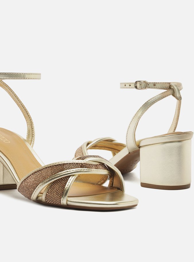 Descrição: Sandália feminina dourada. O sapato tem salto médio bloco e formato arredondado na ponta. Traz tiras largas com aplicação de strass sobre os dedos, formando um enlace. Possui tira fina no calcanhar conectada à tira no tornozelo com fecho em fivela metálica lateral. Com palmilha bege e inscrição do nome da marca.