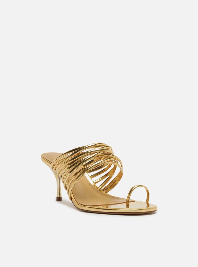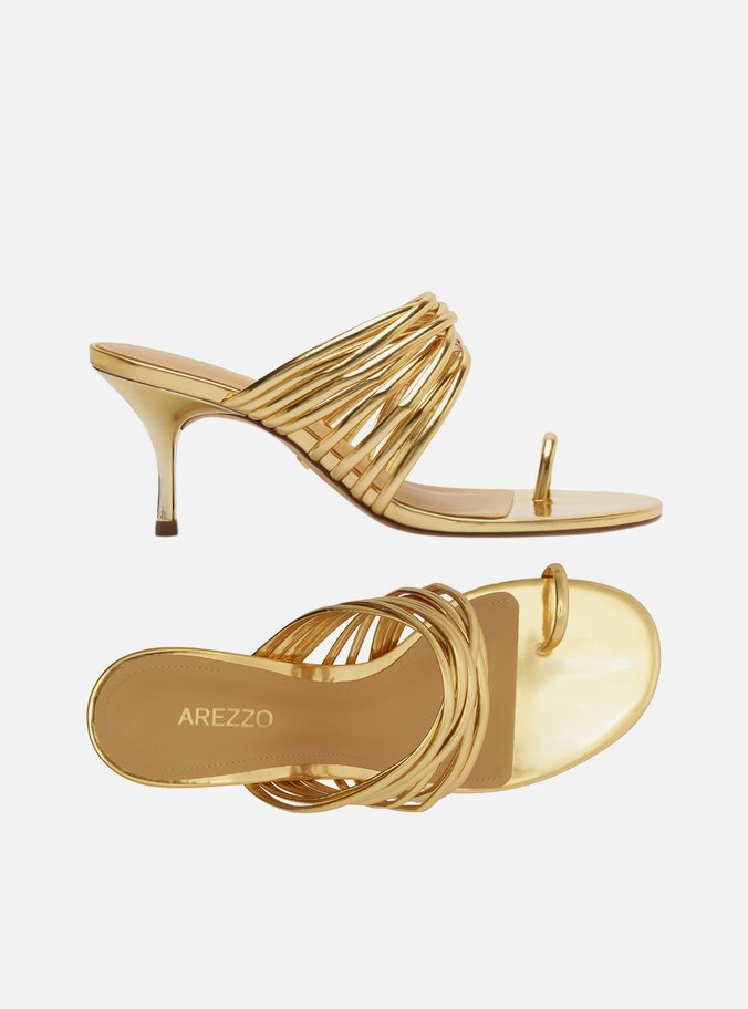 Descrição: Sandália feminina dourada. O sapato tem salto médio fino e formato arredondado na ponta. Traz tira dedeira e várias tiras finas na parte superior do pé. Com palmilha bege e inscrição do nome da marca.