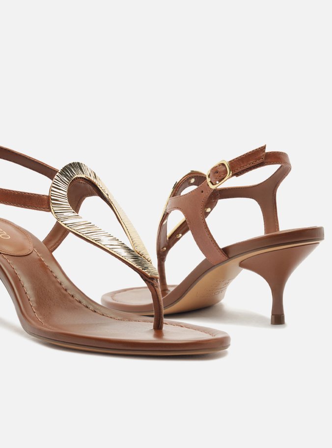 Descrição: Sandália feminina de couro marrom. O sapato tem salto baixo fino e formato arredondado na ponta. Traz tiras finas dividindo os dedos, com aplicação de metal dourado, grande, vazado e com textura riscada no centro. Possui tira na parte superior do pé e tira no calcanhar com fecho em fivela metálica. Com palmilha da cor do calçado, contorno em pesponto e inscrição do nome da marca. A sandália exibe todo o pé.