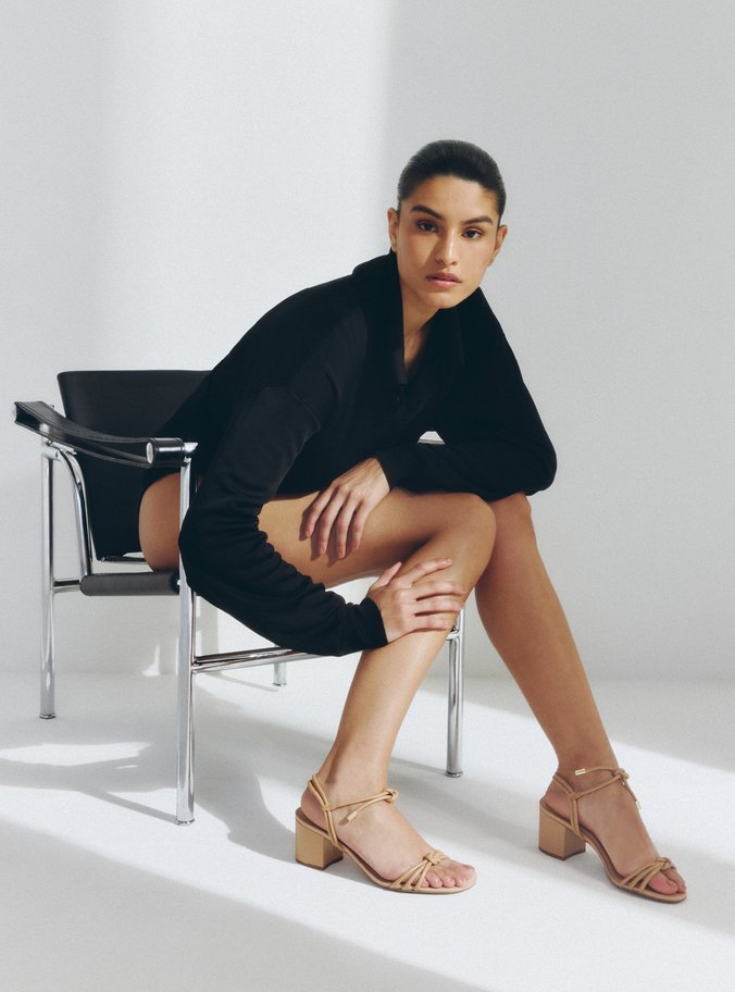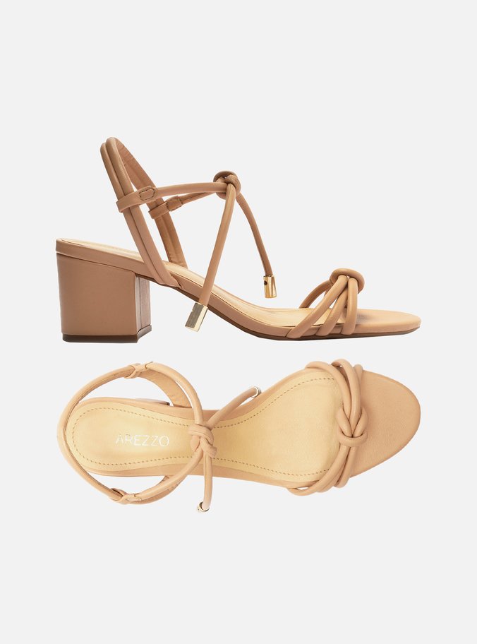Descrição: Sandália nude em couro. O modelo tem salto médio bloco e bico redondo. Traz tiras finas bombadas sobre os dedos, unidas por enlace central, e no peito do pé, conectadas a tira no calcanhar, fechando em amarração no tornozelo. A sandália é aberta e exibe todo o pé