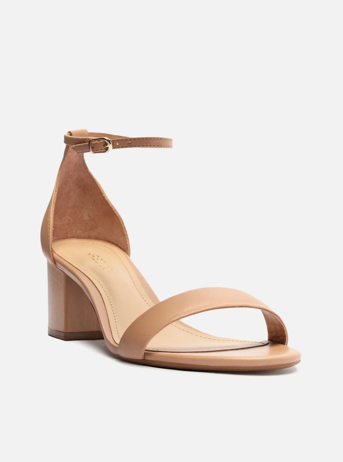 Descrição: Sandália bege nude de couro. O modelo tem salto médio bloco, revestido no mesmo material do calçado, e bico redondo. Traz tira média e lisa sobre os dedos. Fechada no calcanhar, possui tira fina em torno do tornozelo com fivela metálica lateral. Com palmilha bege e inscrição do nome da marca. A sandália exibe todo o peito do pé e os dedos.