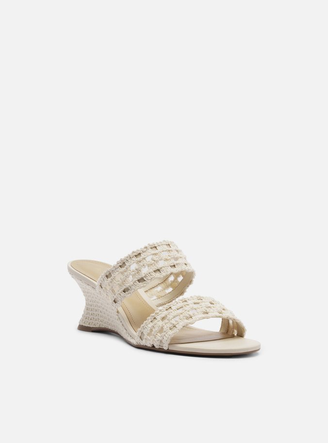 Descrição: Sandália off-white. O sapato tem salto médio anabela levemente curvo e revestido em material bordado. Traz duas tiras largas em crochê vazado, sobre os dedos e a parte superior do pé, e palmilha off-white com inscrição do nome da marca. Aberta, exibe todo o pé.