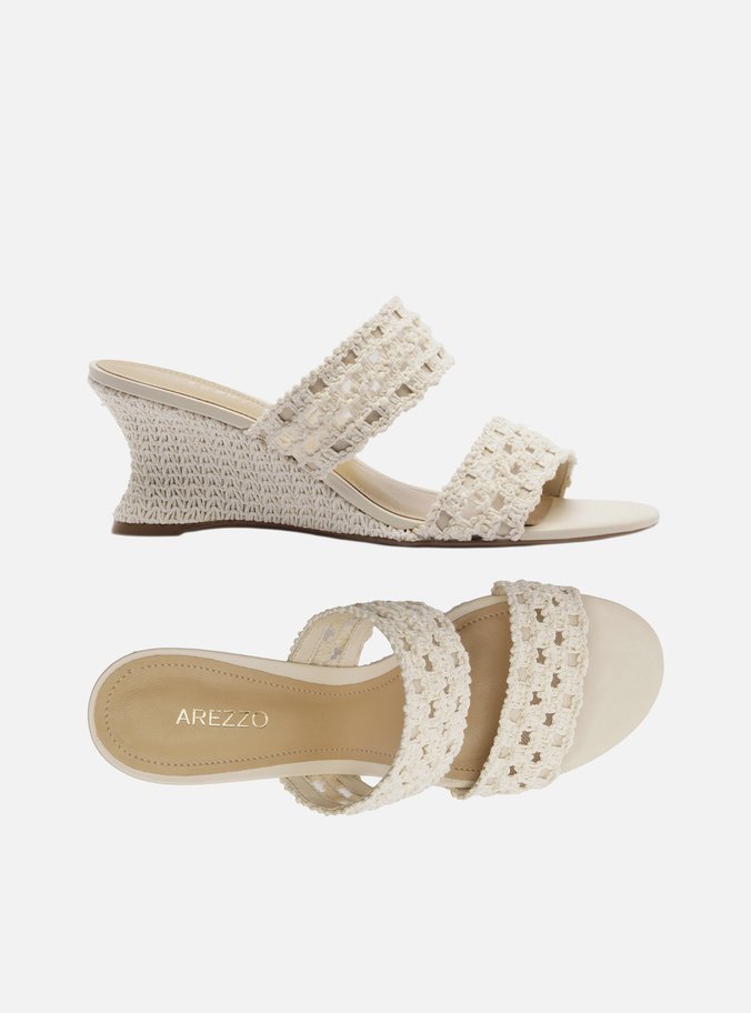 Sandália Off-White Anabela Salto Médio Tiras Crochê