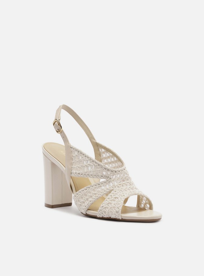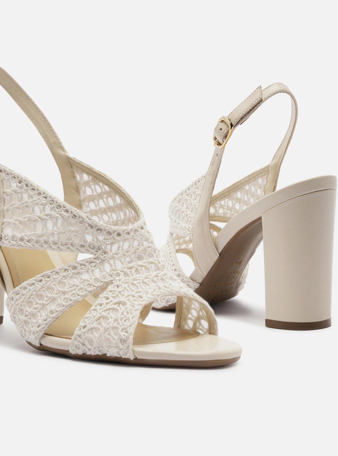 Descrição: Sandália feminina off-white. O sapato tem salto alto bloco e formato arredondado na ponta. Traz cabedal bordado com recortes vazados, formando tiras largas sobre os dedos e a parte superior do pé. Possui tira fina que sai das laterais, contorna o calcanhar e fecha em fivela lateral. Com palmilha bege e inscrição do nome da marca.
