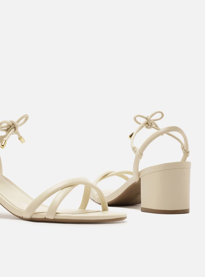 Descrição: Sandália feminina off white. O sapato tem salto médio bloco e formato arredondado na ponta. Possui tiras finas cruzadas sobre os dedos e tira no calcanhar conectada a amarração no tornozelo, que fecha em laço. Com palmilha da cor do calçado e inscrição do nome da marca.