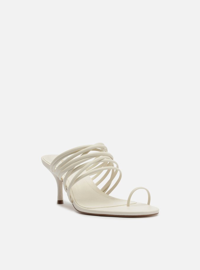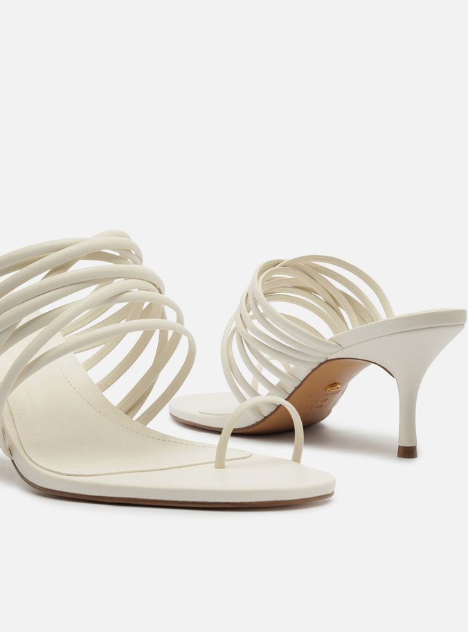 Descrição: Sandália feminina off white. O sapato tem salto médio fino e formato arredondado na ponta. Traz tira dedeira e várias tiras finas na parte superior do pé. Com palmilha off white e inscrição do nome da marca.
